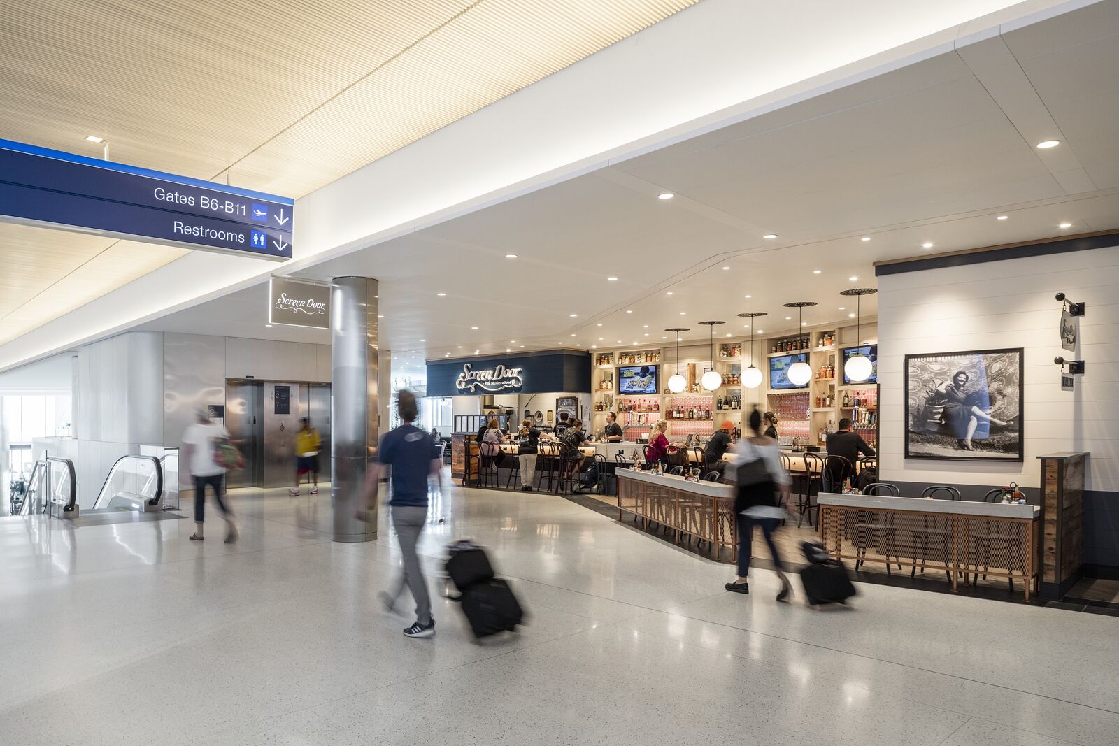 The Portland International Airport has a long history of prioritizing public space and ensuring all people have amenities and experiences that are open to them pre-security. Case in point: the new stadium seating at the heart of the new terminal which provides ticketed passengers, the general public, and airport employees alike with "free space" to relax or dine.