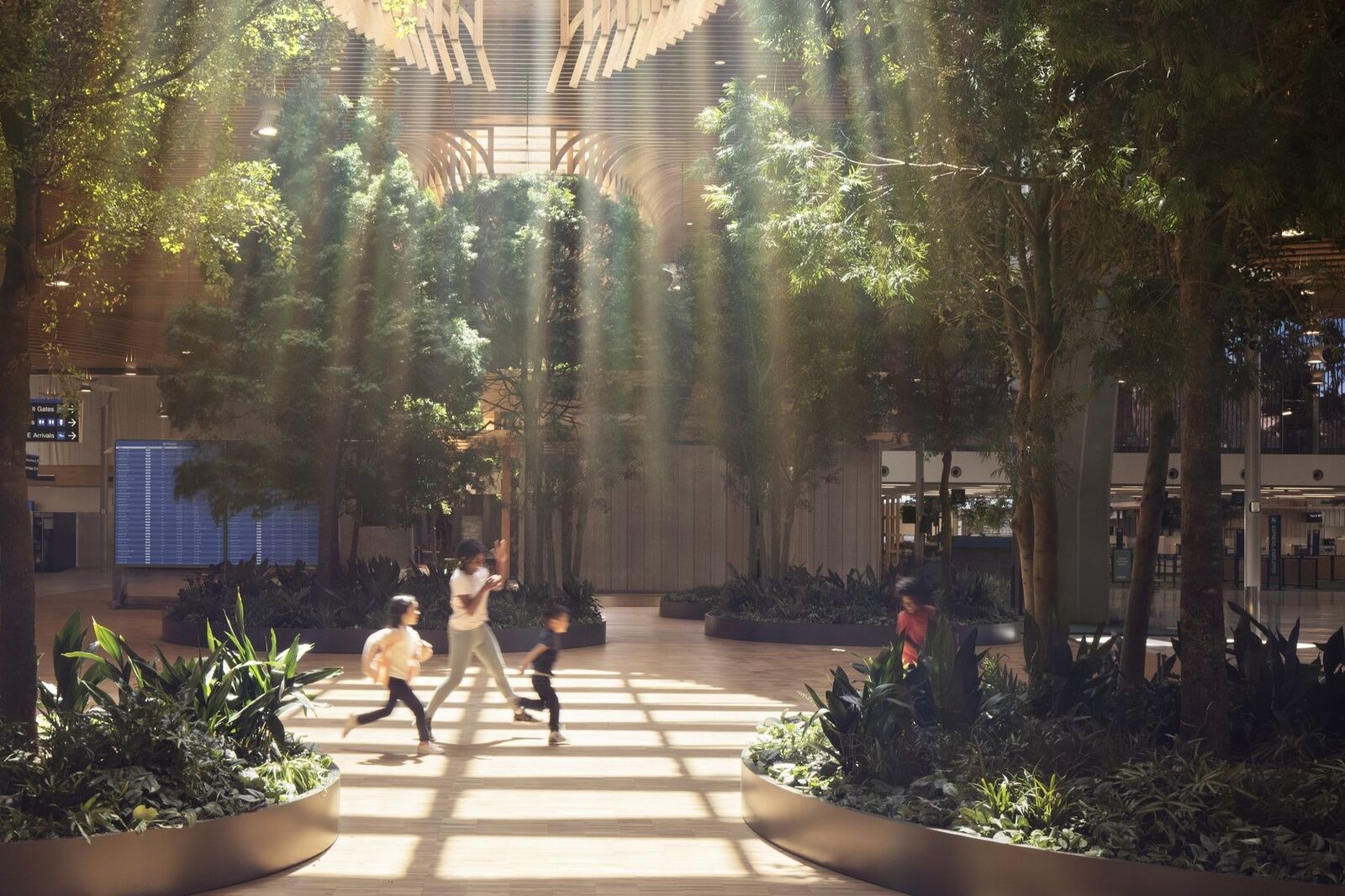 The 9-acre mass timber roof for the main terminal expansion at PDX Airport utilized a prefab/modular approach which significantly reduced the overall duration of construction, optimized efficiencies, and reduced cost. The wood overstory punctuated with skylights provides passengers with access to natural materials and daylight to reduce the stress of travel.