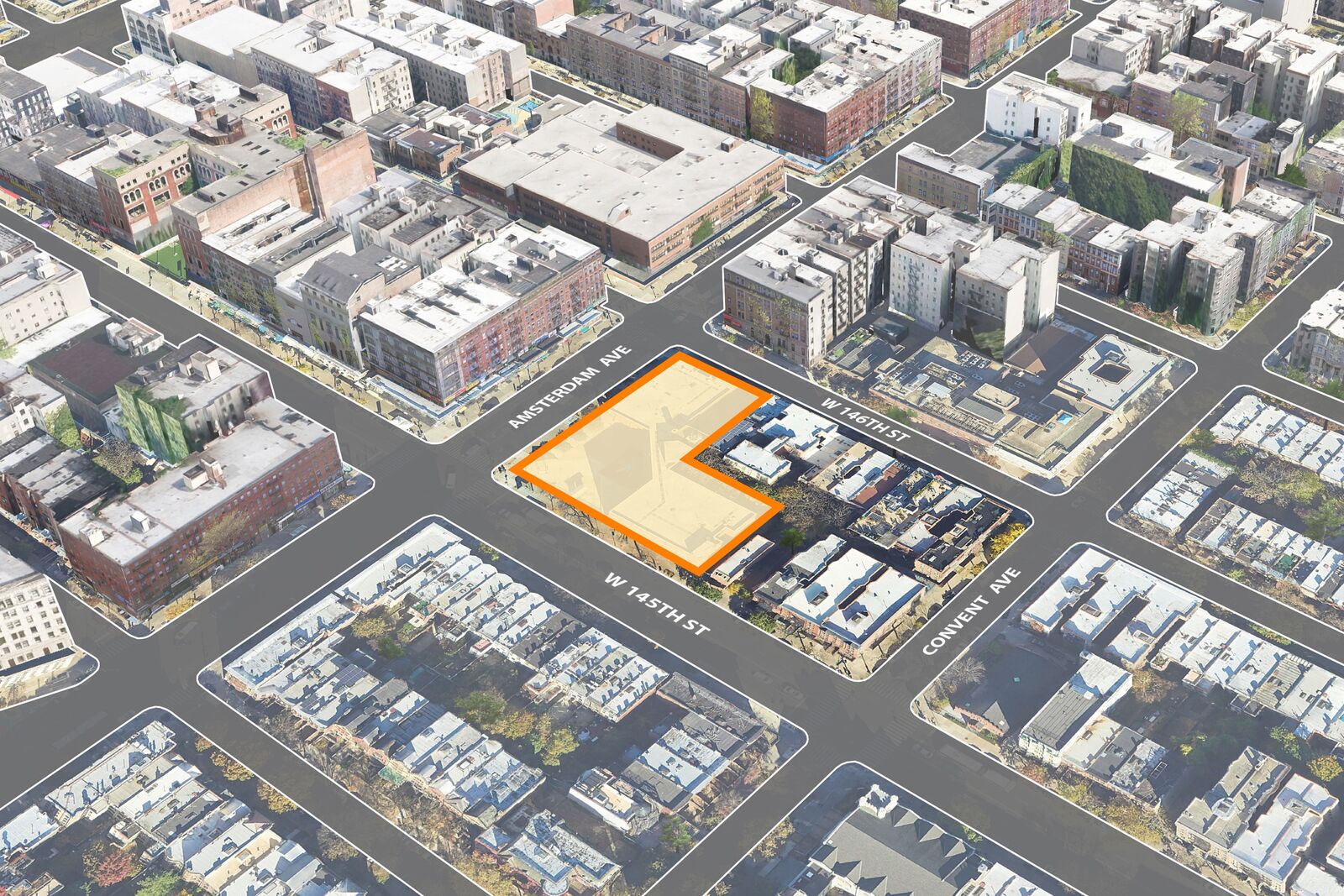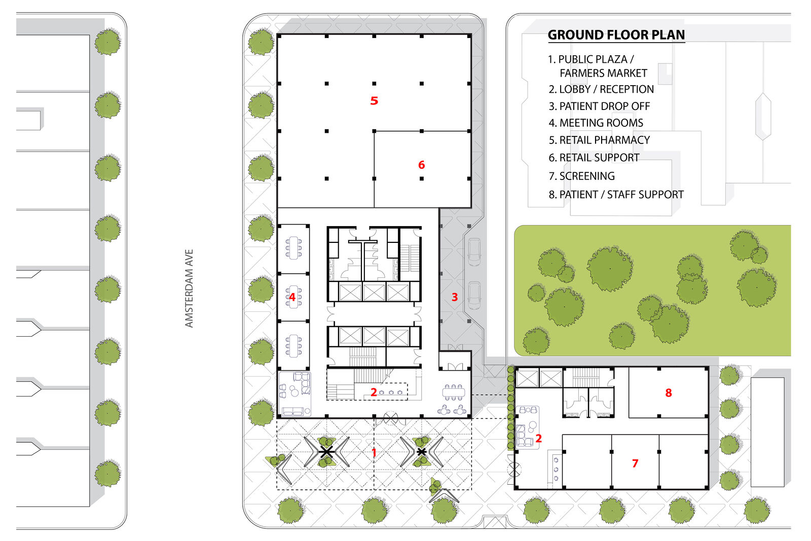 The site, at the intersection of West 145th St and Amsterdam Ave in Harlem, currently houses a community health center slated for demolition. The ground floor of the community healthcare concept includes a plaza to expand the public realm and provide the opportunity for community gatherings.