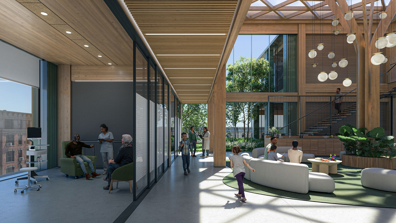 The design leverages the benefits of wood for wellness, including creating warm and welcoming clinical spaces. Families and patients could receive support in a naturally biophilic environment with access to ample natural daylight, which can reduce stress and improve patient outcomes.