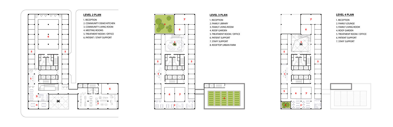 ZGF explored what this facility could become if re-imagined in mass timber and focused on addressing access and removing barriers to care by creating a destination that would support the neighborhood community both in times of health and illness. The concept features an expanded program that includes a variety of healthcare services from screening to treatment, and food and nutrition education, including a community space anchored by a demonstration kitchen and supplied by a rooftop urban farm. A plaza expands the public realm and provides the opportunity for formal and informal gatherings, including a farmer’s market which could provide fresh produce to the community and support local small business opportunities.