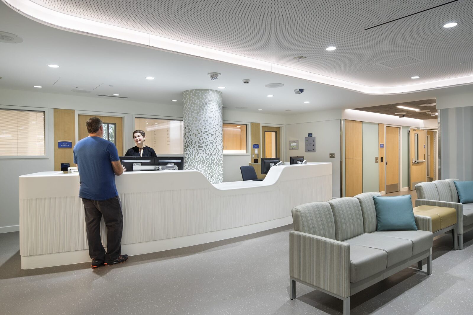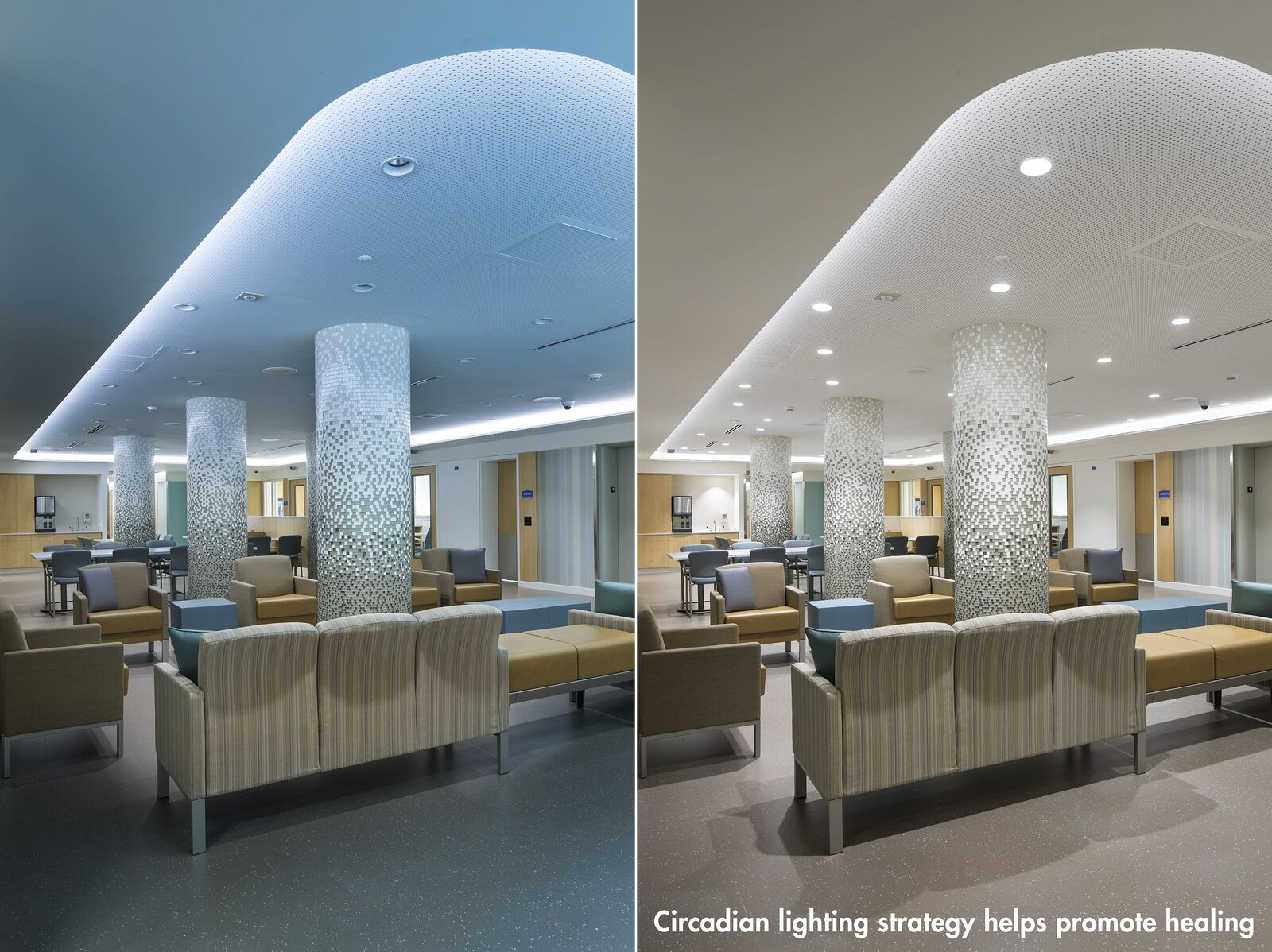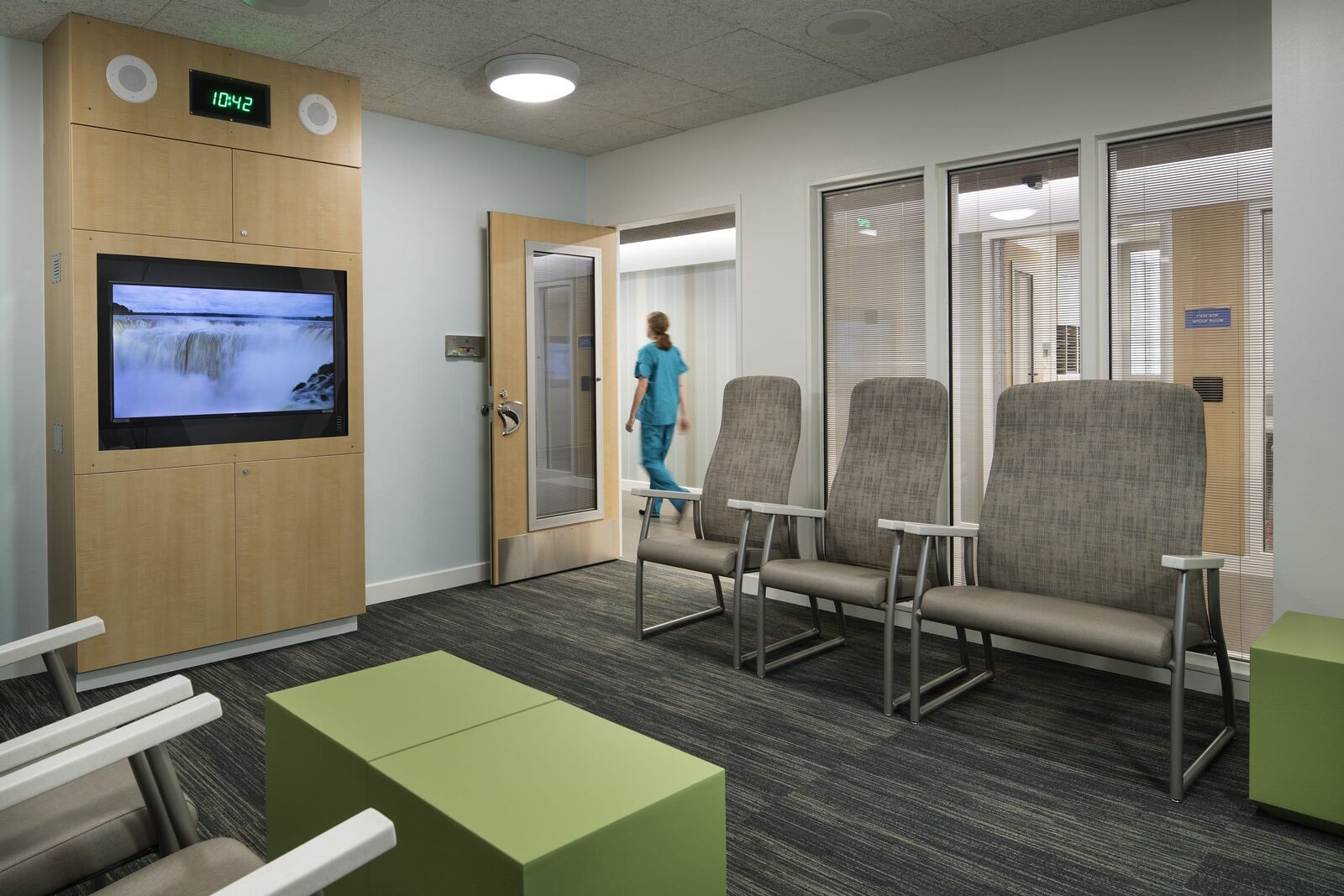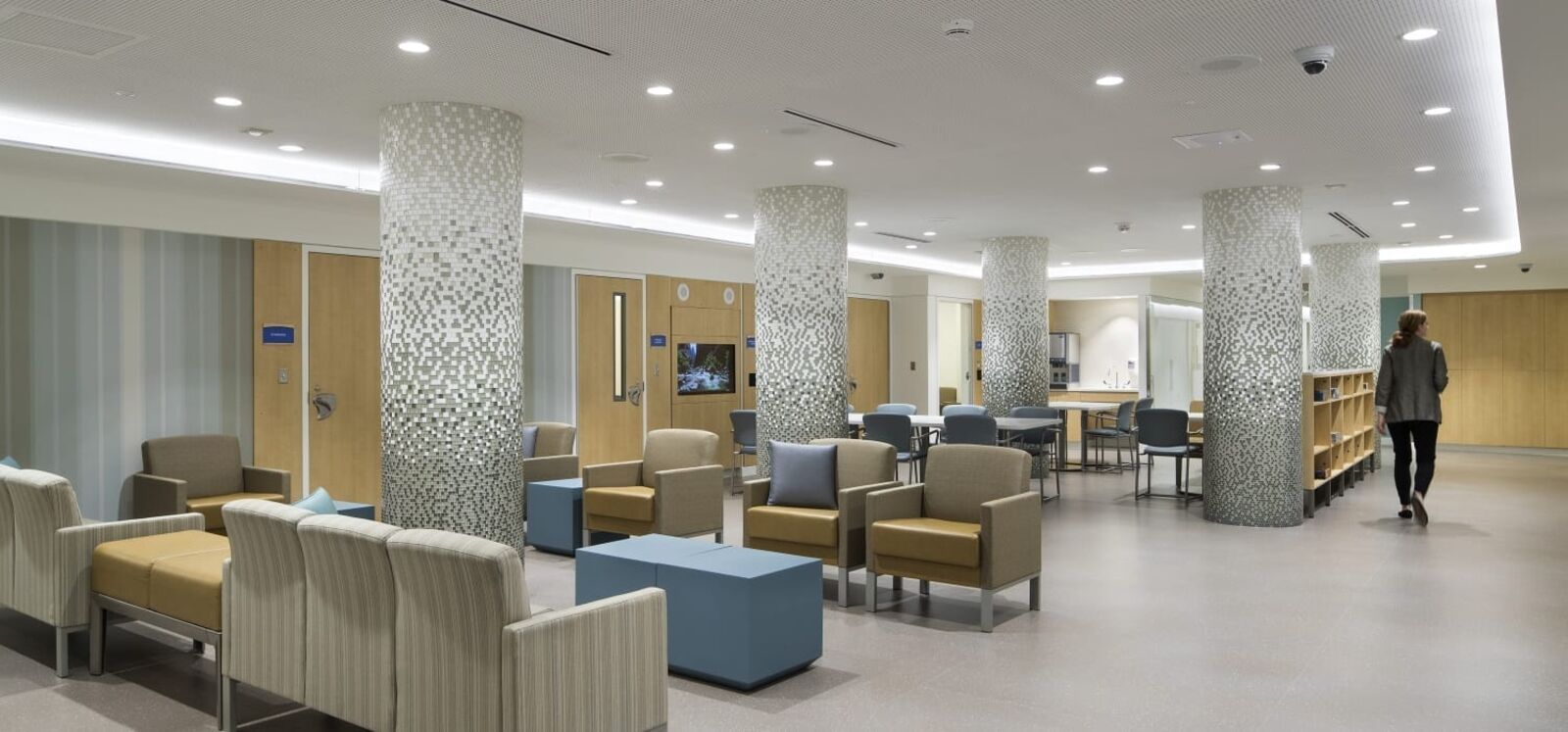 ZGF provided planning and design for the 15,605 SF expansion and relocation of Swedish Medical Center’s Behavioral Health Unit from a high acuity, urban campus to a community hospital campus in Seattle’s Ballard neighborhood. Located on two floors, the project increases the number of patient beds from 10 to 22, and the Unit’s design creates a calm and soothing space that promotes recovery, mindfulness, respect and safety. Light colors and subtle texture on the walls provide visual interest. Materials that absorb sound—rubber floors and special ceiling tiles—foster a peaceful environment. Interior touches, such as mosaic tiles in the common area, provide textural interest while connecting patients to nature. The gradual change in tile color, from dark to very light at the ceiling plane, is a strategy of biophilic design that connotes the relationship between earth and sky. Lighting design throughout the Unit supports patients’ circadian function. This lighting changes through the course of a day to mimic the color and intensity of the sun’s light to support healthy circadian rhythms, which have been shown to increase the rate of healing and the effectiveness of the body’s absorption of medicine. Lights in comfort rooms offer patients the ability to change the shade of lighting as a calming effect and a measure of control.