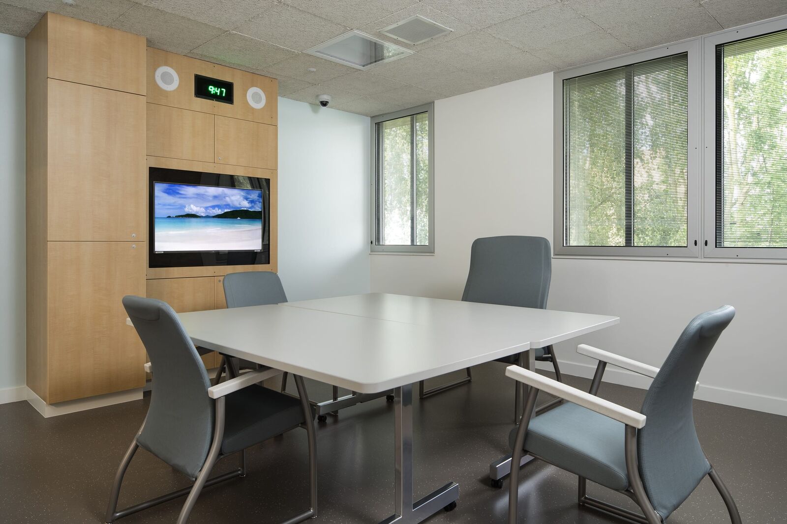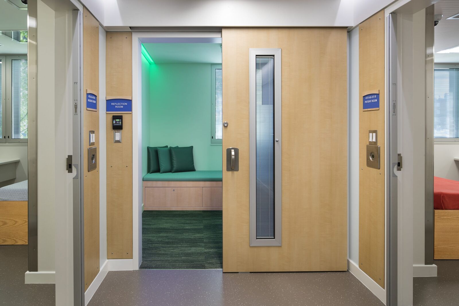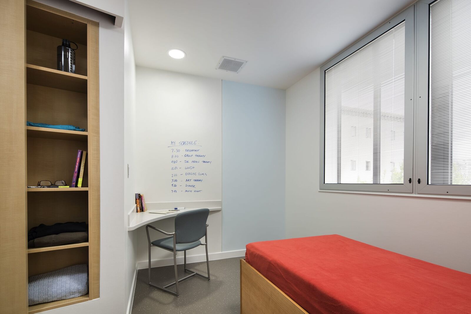 ZGF provided planning and design for the 15,605 SF expansion and relocation of Swedish Medical Center’s Behavioral Health Unit from a high acuity, urban campus to a community hospital campus in Seattle’s Ballard neighborhood. Located on two floors, the project increases the number of patient beds from 10 to 22, and the Unit’s design creates a calm and soothing space that promotes recovery, mindfulness, respect and safety. Light colors and subtle texture on the walls provide visual interest. Materials that absorb sound—rubber floors and special ceiling tiles—foster a peaceful environment. Interior touches, such as mosaic tiles in the common area, provide textural interest while connecting patients to nature. The gradual change in tile color, from dark to very light at the ceiling plane, is a strategy of biophilic design that connotes the relationship between earth and sky. Lighting design throughout the Unit supports patients’ circadian function. This lighting changes through the course of a day to mimic the color and intensity of the sun’s light to support healthy circadian rhythms, which have been shown to increase the rate of healing and the effectiveness of the body’s absorption of medicine. Lights in comfort rooms offer patients the ability to change the shade of lighting as a calming effect and a measure of control.