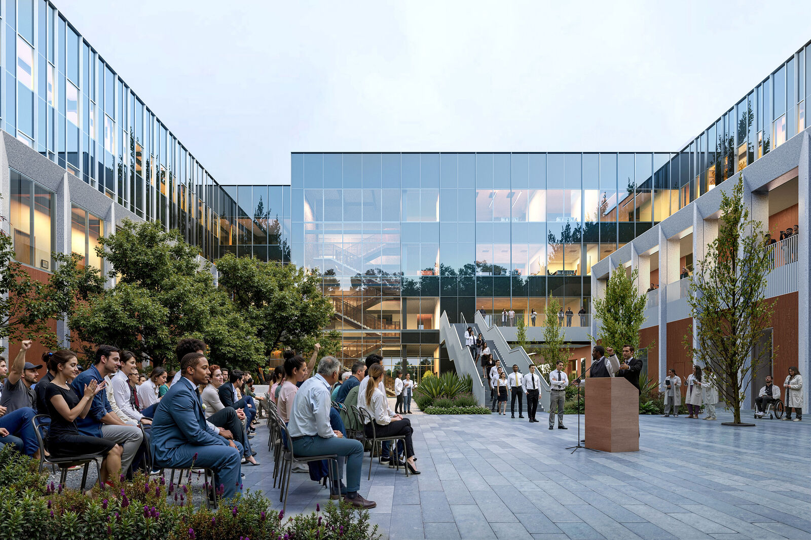 To establish a strong sense of community, place, and belonging, a central courtyard serves as the building’s primary organizing element. This spatial solution creates a home-away-from-home for medical students by structuring daily experiences around a shared, open-air environment. Facilitating memorable moments beyond the classroom, the courtyard serves as both a daily gathering space and a venue for celebrating milestones reinforcing a sense of community and achievement. Exterior circulation on the second level frames the courtyard, with a prominent stair that descends to the ground level to accommodate white coat ceremonies and graduations. The building mass is oriented to regulate the courtyard’s microclimate for optimized user comfort, offering shade during hotter months while allowing natural light to filter in year-round.