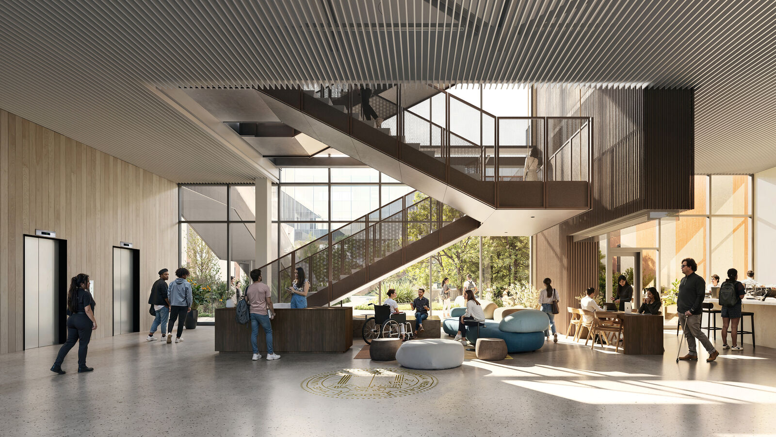 Architecturally, the building extends UC Merced’s design language that’s rooted in the region’s agricultural heritage, while expanding its expression. The architecture is inspired by the San Joaquin valley’s cultivated agricultural fields, where orderly rows of crops stretch toward the Sierra Nevada foothills. This is reflected in the rhythmic repetition of the vertical bars and colonnades that define the façade, materialized in wheat-colored precast concrete to establish continuity with the main campus. At the ground level, a rust-colored steel plinth contrasts with the façade, creating a greater sense of energy and warmth at the ground level and establishing a subtle nod to the metal structures of the agrarian landscape of the valley.