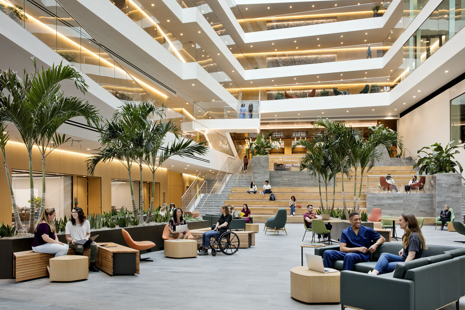 Given the rigorous demands of medical school, coupled with UC Merced’s predominantly first-generation student population and the building’s mission to increase the number of doctors in the valley, the interior environment is intentionally designed to support student success. Throughout its four stories, interprofessional collaboration, research, and hands-on learning are supported in an environment that imparts a sense of belonging, promotes wellness, and evokes a sense of mutual support through shared experiences.