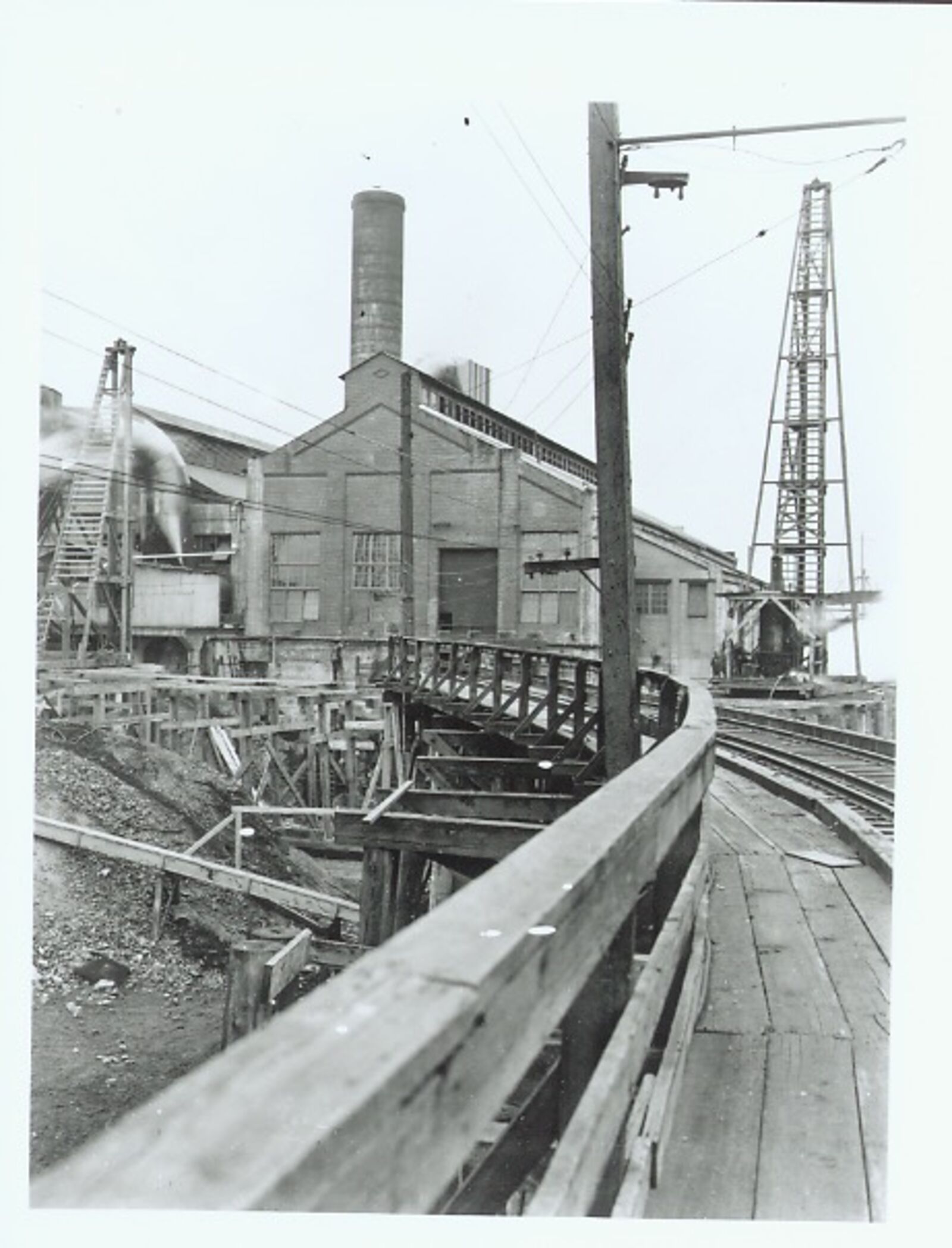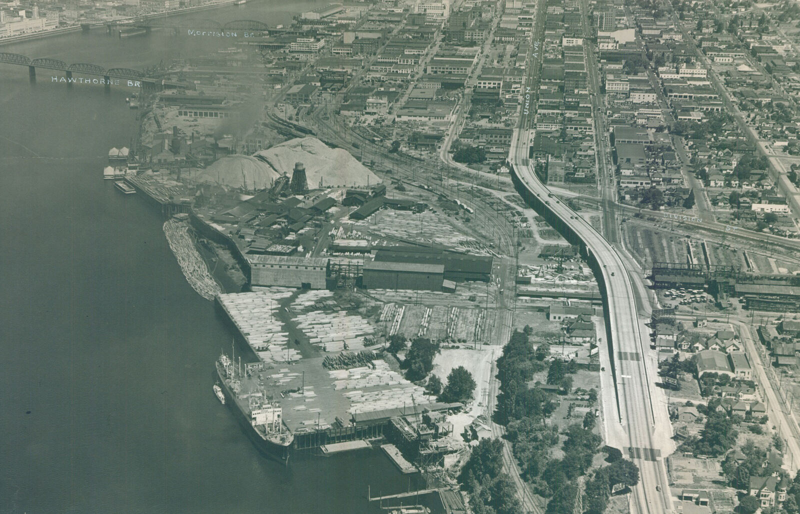 Portland's Central Eastside waterfront circa 1940. Note large pile of wood debris, used to power steam turbines for power generation, with turbine hall at rear.