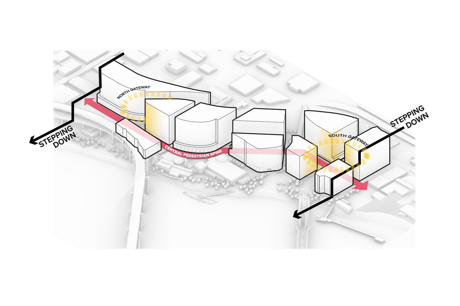 The master plan organizes the district through four major framework components: two distinct gateways, a central north-south pedestrian spine, a "ladder" of east-west connections, and a collection of gathering nodes. Design tenets respond to the existing context: honor the scale of OMSI buildings through height limits and setbacks, focus activity on the central pedestrian spine, step buildings down to the river, create gateways at the north and south ends of the district, and provide east-west connections to establish or reinforce connections to the river.