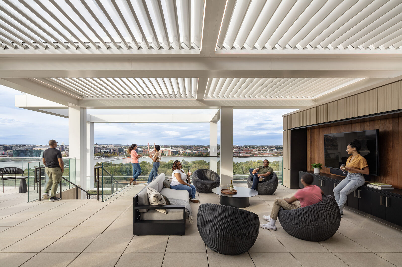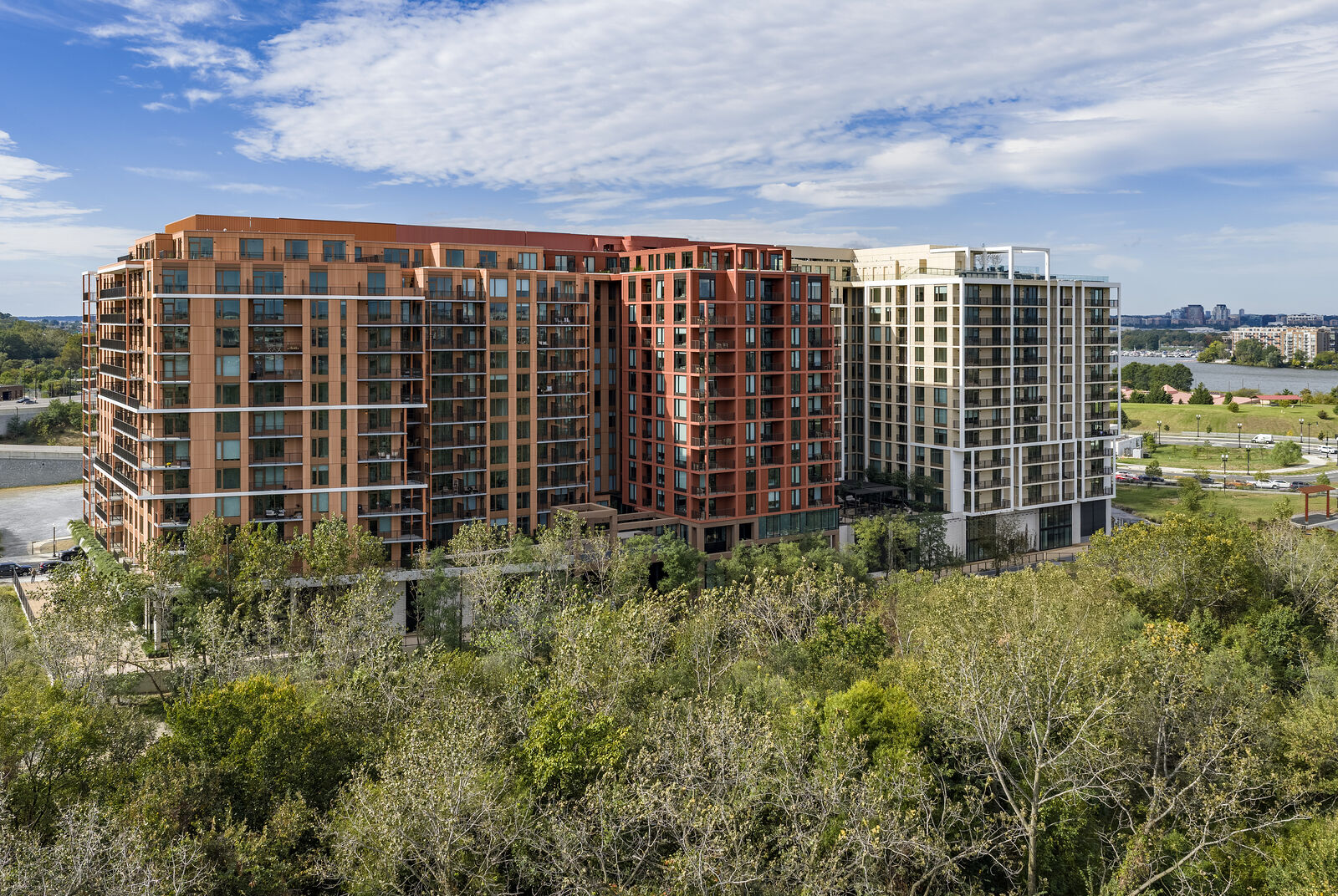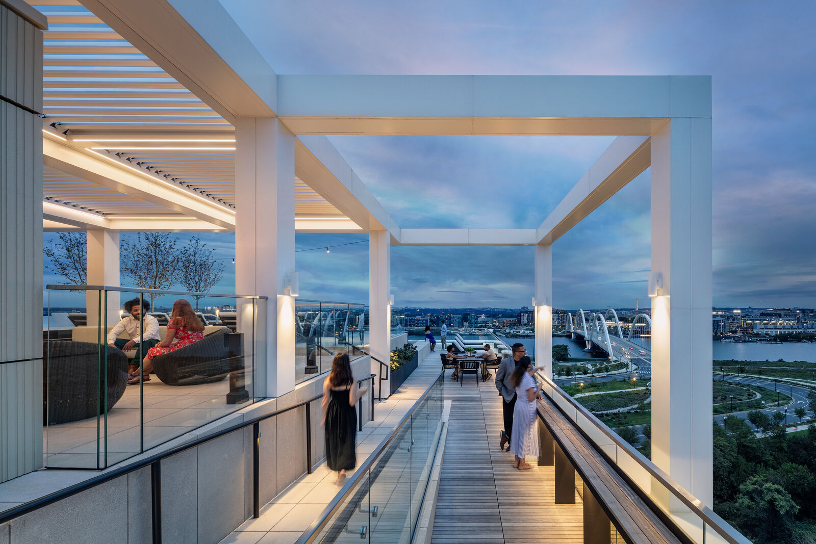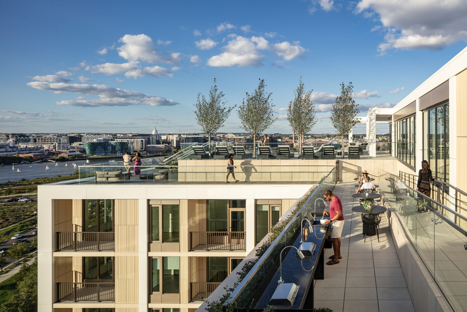 Through a focus on natural daylighting, views to nature, and indoor-outdoor connections, Phase One of the Bridge District prioritizes residents’ health while also catering to the demands of the work-from-home era. The building is located along the southern bank of the Anacostia River and is adjacent to an expansive park and trail network. To capitalize on the site’s expansive viewsheds, the towers form is sculpted to maximize the number of units with monument and river views and to optimize opportunities for natural daylighting. A park-facing lobby provides direct connection into Poplar Point and a future pedestrian promenade. In addition to private balconies, which are included with more than 80% of units, residents can access uniquely programmed outdoor terraces, including landscaped courtyards, a yoga terrace, and a rooftop pool deck.