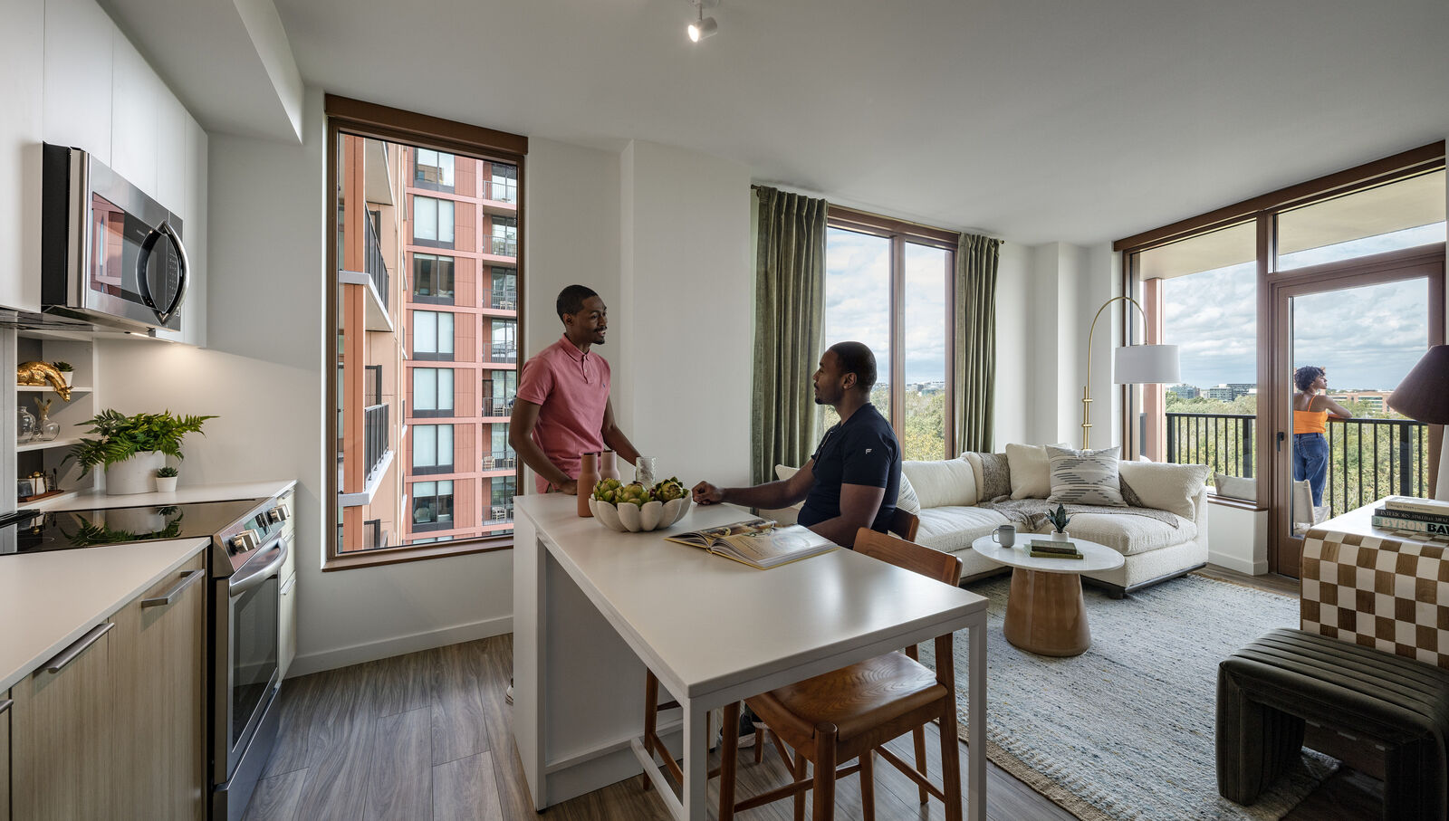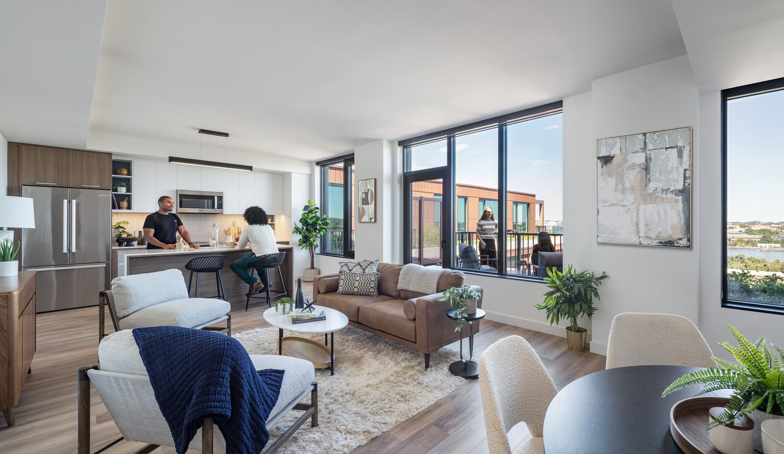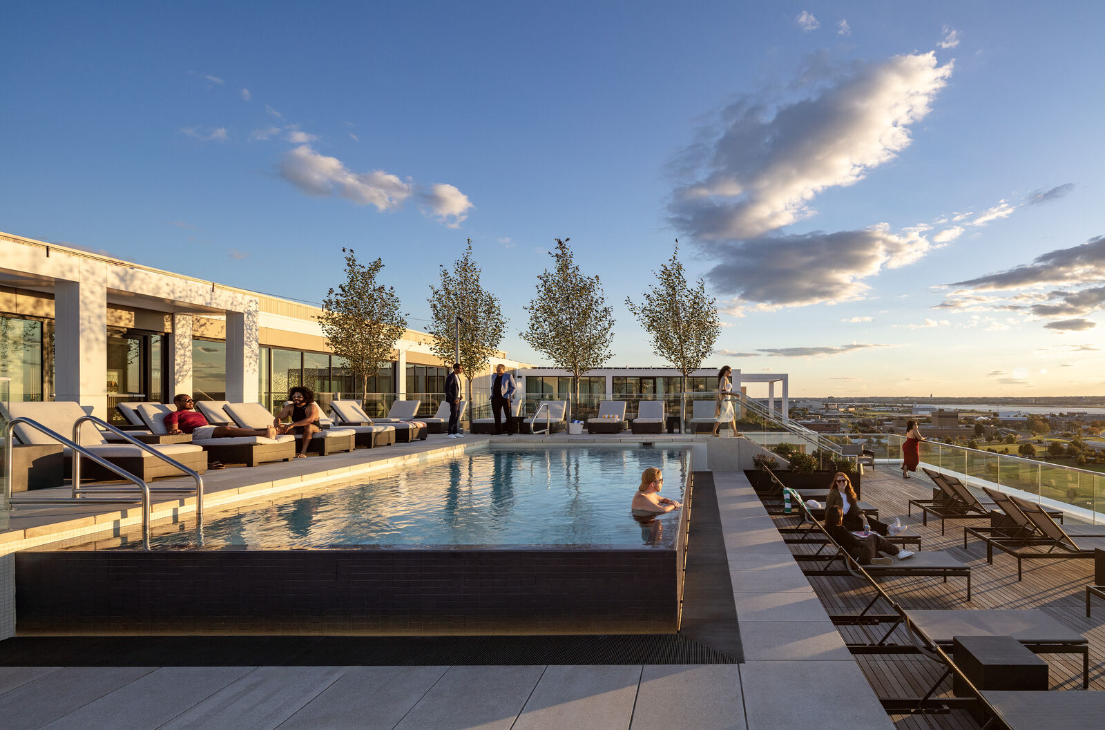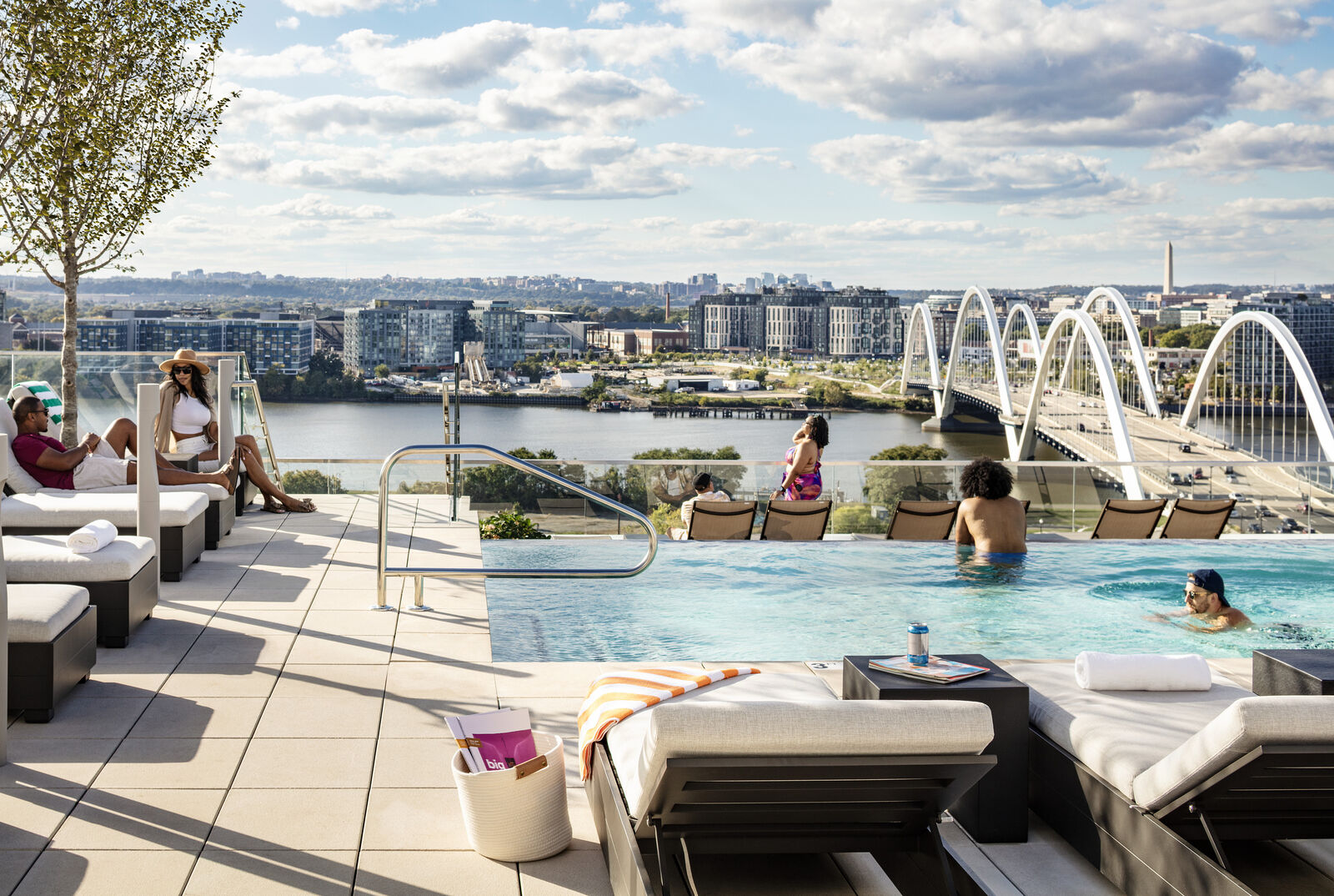 Through a focus on natural daylighting, views to nature, and indoor-outdoor connections, Phase One of the Bridge District prioritizes residents’ health while also catering to the demands of the work-from-home era. The building is located along the southern bank of the Anacostia River and is adjacent to an expansive park and trail network. To capitalize on the site’s expansive viewsheds, the towers form is sculpted to maximize the number of units with monument and river views and to optimize opportunities for natural daylighting. A park-facing lobby provides direct connection into Poplar Point and a future pedestrian promenade. In addition to private balconies, which are included with more than 80% of units, residents can access uniquely programmed outdoor terraces, including landscaped courtyards, a yoga terrace, and a rooftop pool deck.
