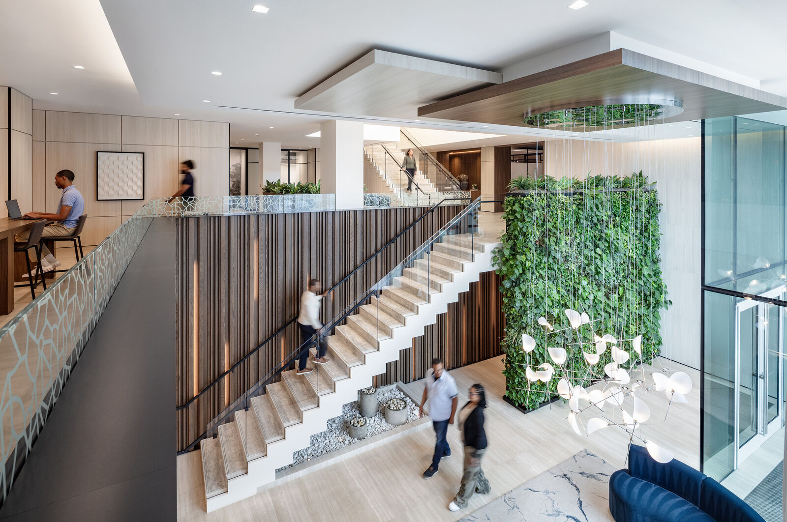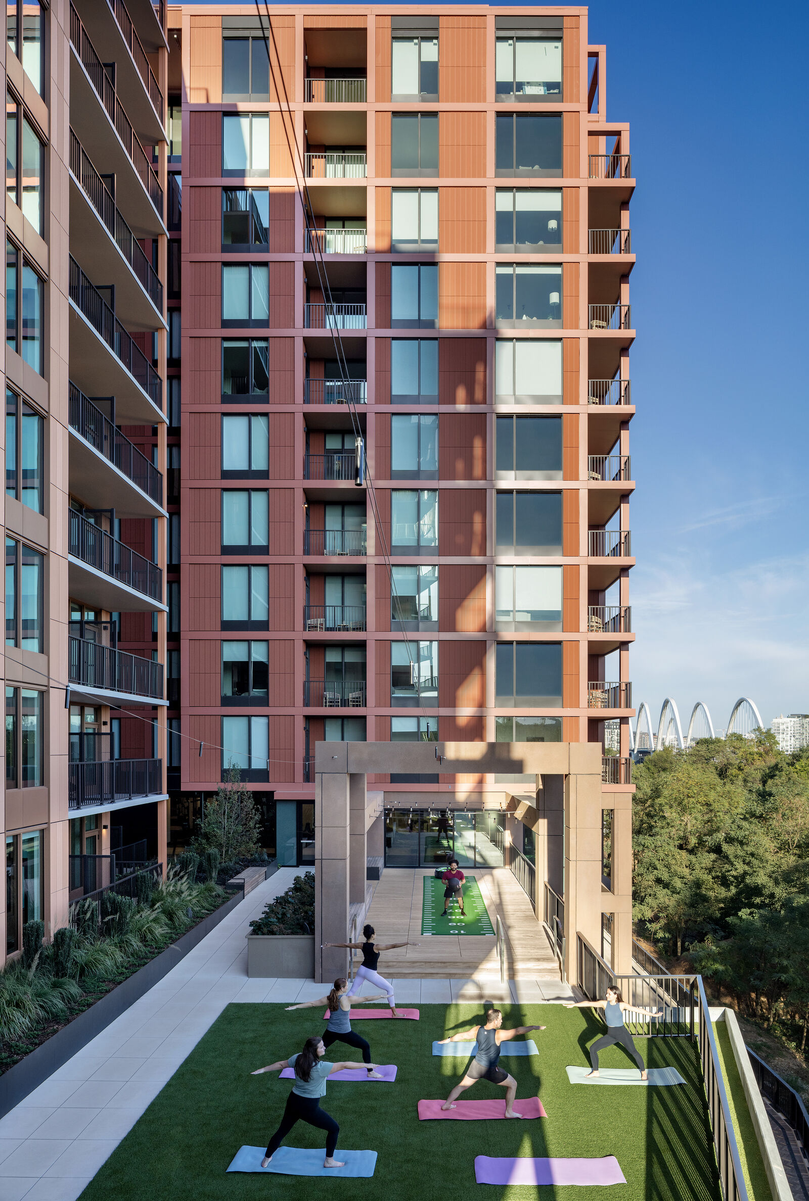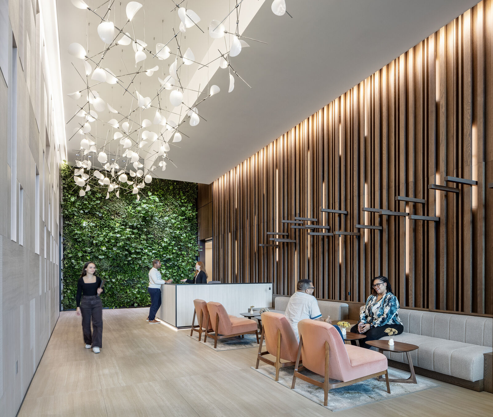 Additional amenities—a fitness center, a dog spa, bike lounge, event rooms, and a children’s playroom—center around wellness and multigenerational living. The building also incorporates biophilic elements including exterior and interior green walls, natural materials, and interior plantings.