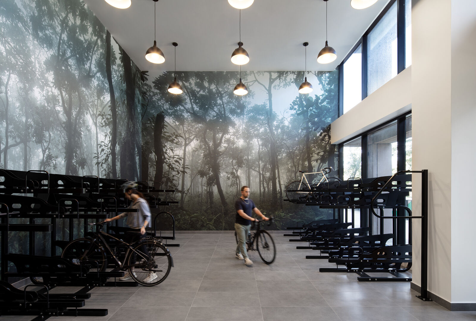 The bike lounge includes parking, a repair station, and a wash station to make bike use more convenient for residents.