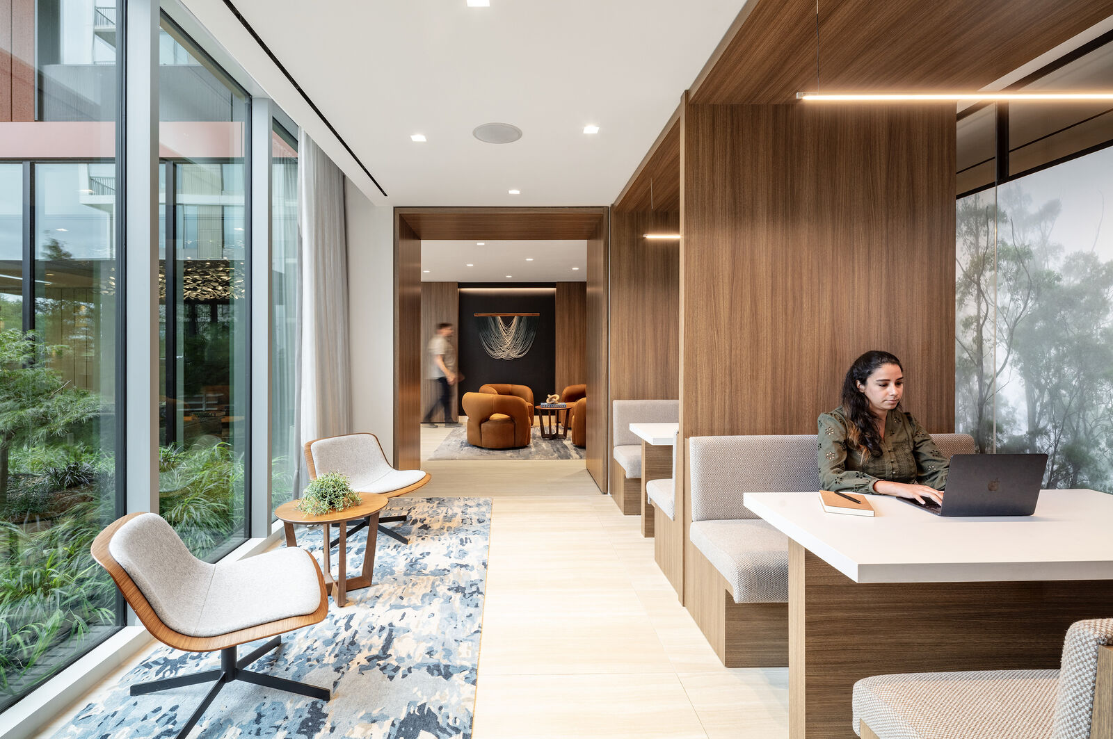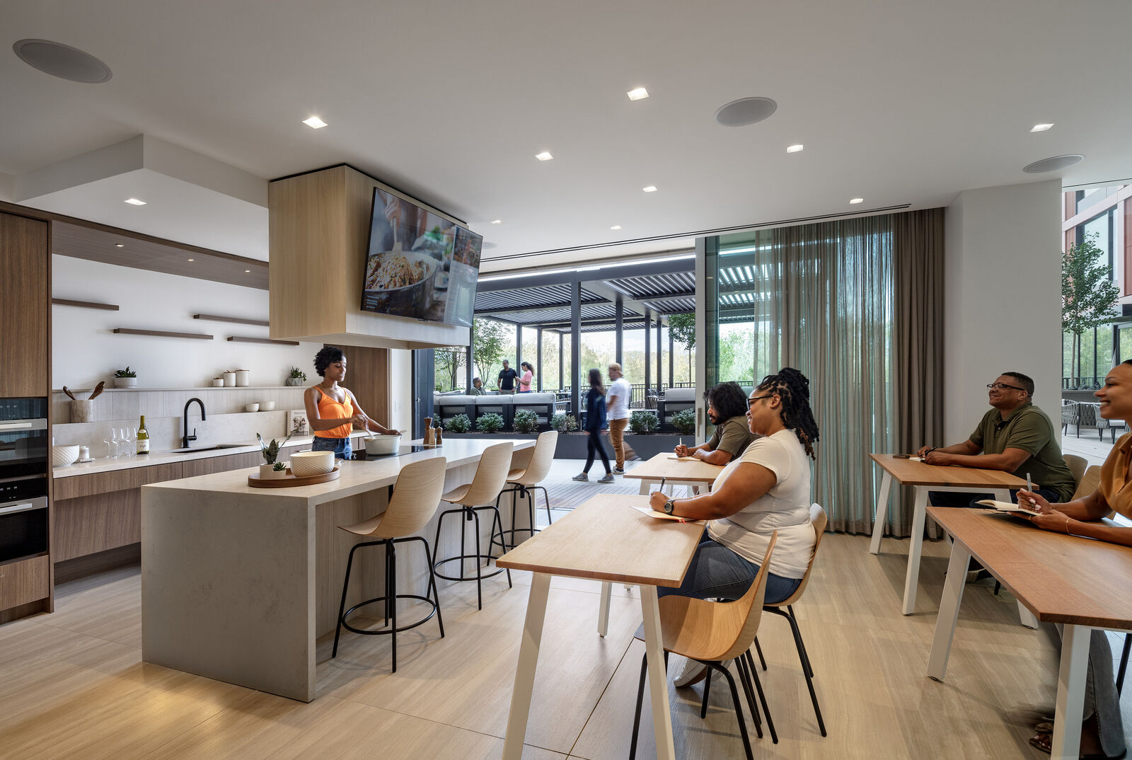 A demonstration kitchen and wine bar brings residents together through regular culinary classes meant to be enjoyed and shared. Floor-to-ceiling sliding doors open directly onto the event terrace so gatherings can continue long after classes are over.