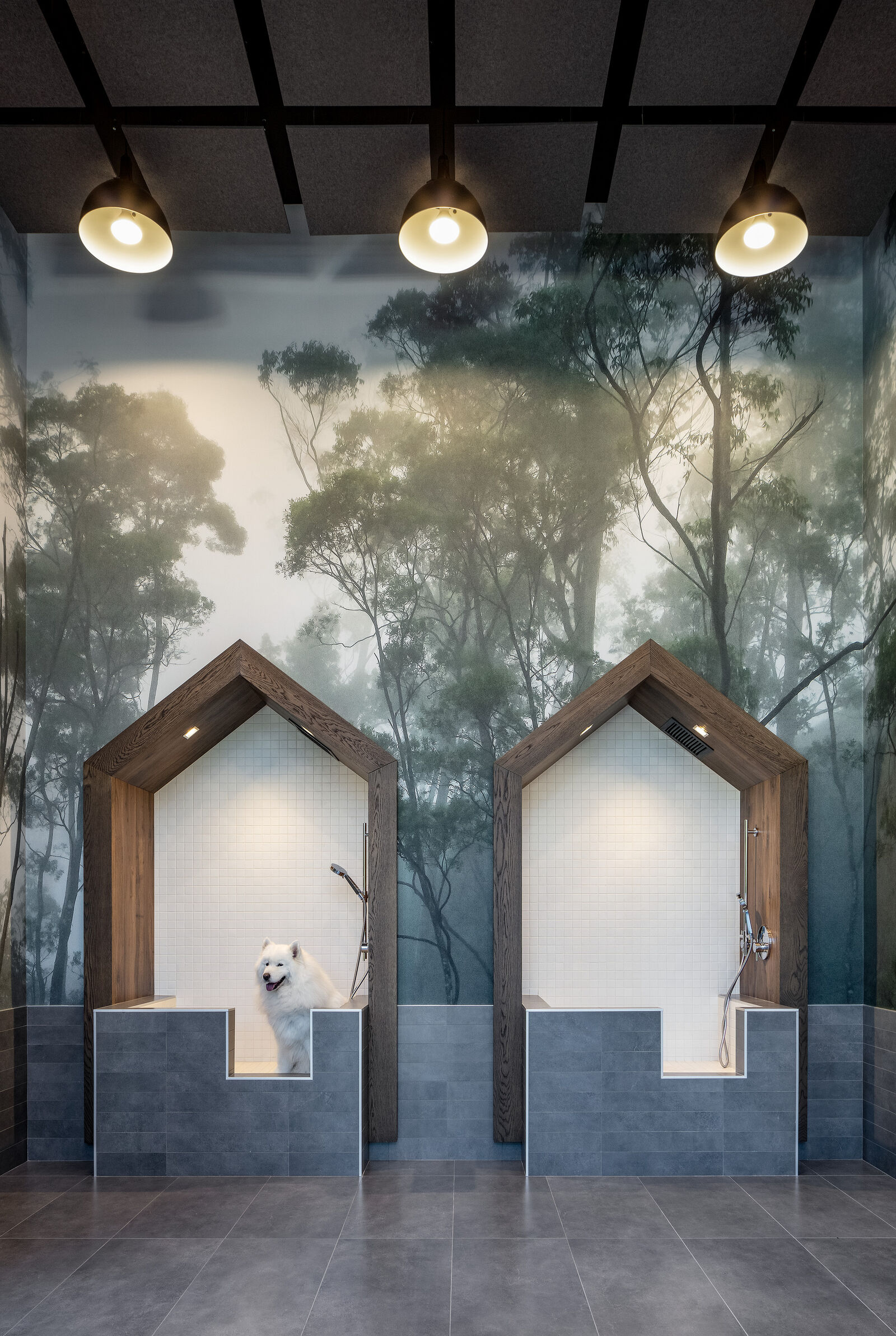 The dog spa imbues forest wallpaper and wood accents to evoke a tranquil, nature-inspired environment for pets to feel at ease.