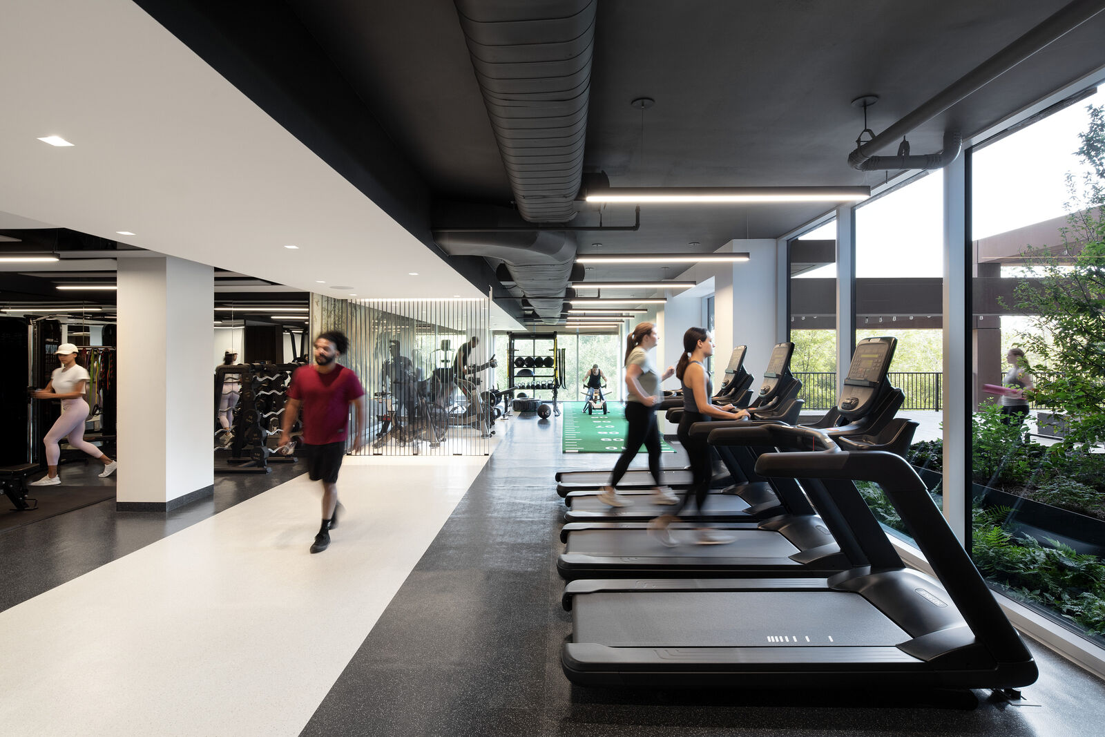 Spilling out of the fitness center is an exercise terrace that provides an outdoor space for cardio and strength training as well as lawn space for morning yoga sessions.