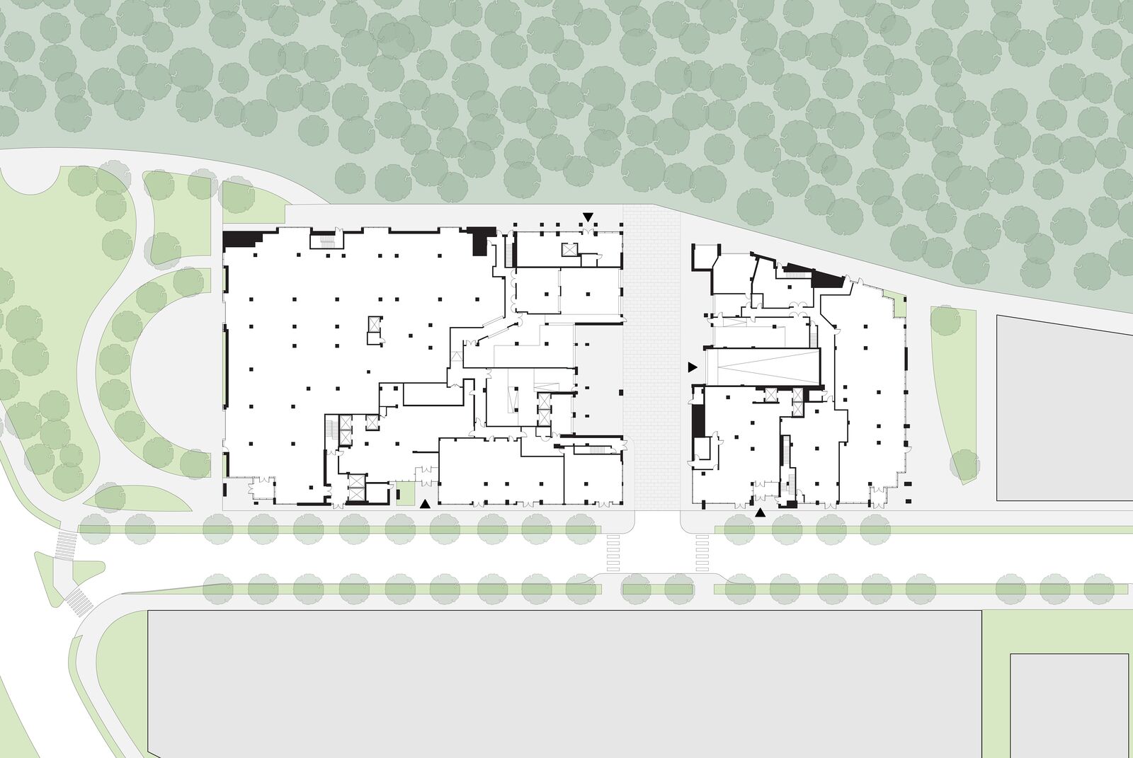 The ground floor serves the public with active pedestrian spaces and retail on all four sides of the building.