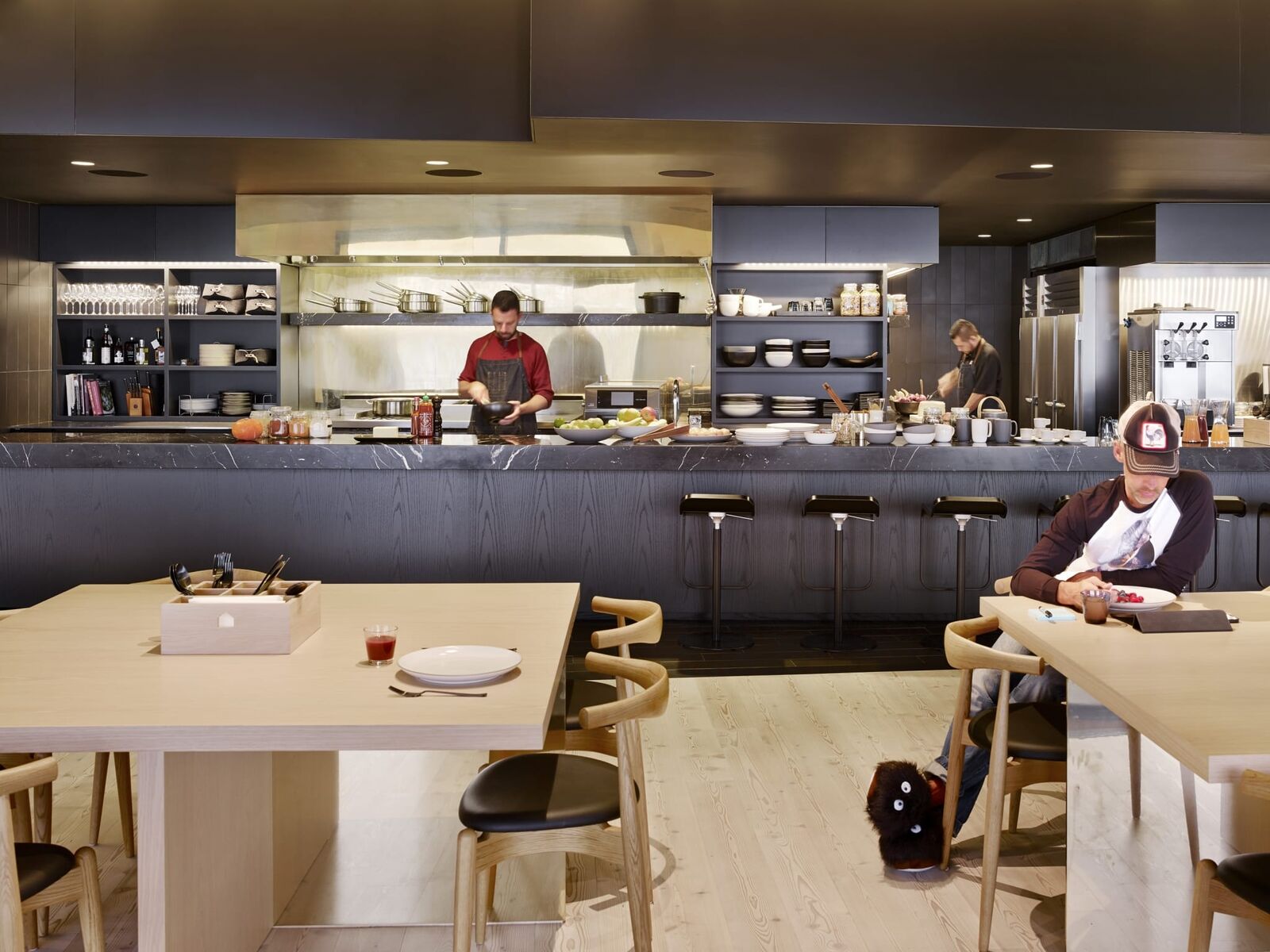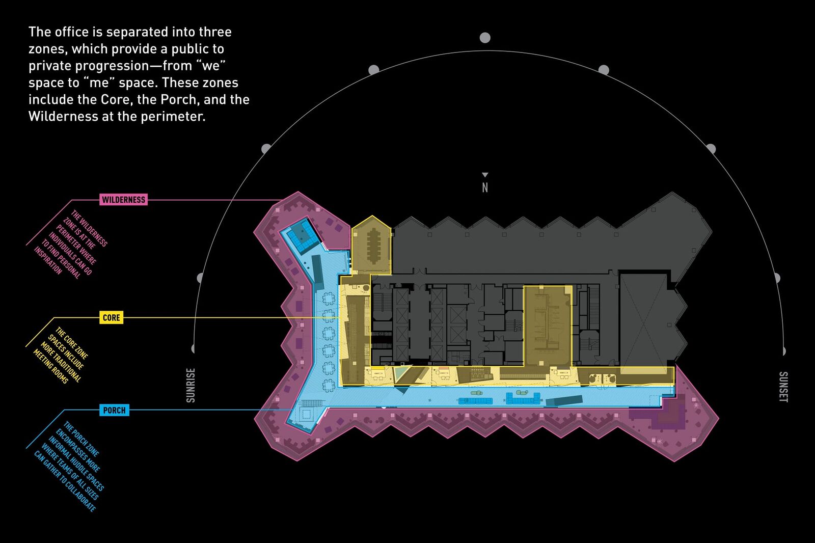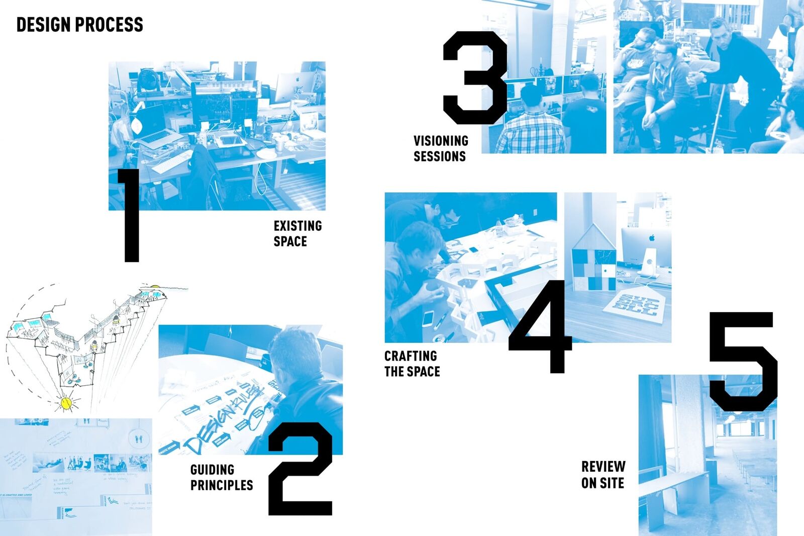 Founded on a few core beliefs, this gaming company has thrived on its outlook of building its environment, culture, and market success around its talent. The design of the new 16,000 SF headquarters in San Francisco was informed by discussions related to line of sight, sharing of work information in digital format and in real time, transparency within, support for both focused work and collaboration, spaces for large group (all-hands) gatherings, and a love of food and drink to bring everyone together. Furniture systems and objects are incorporated to influence and support these work habits. The office organization was influenced by the movement of the sun throughout the space. For example, collaborative areas that require control of light and acoustics are located next to the building core. Heads-down, more focused areas are located around the perimeter, and are the most removed from the collaborative zones. Impromptu “huddle” spaces are integrated in between. Given that screen-share is such an important part of their work, the space supports interaction with this medium in a way that is integral to the architecture.