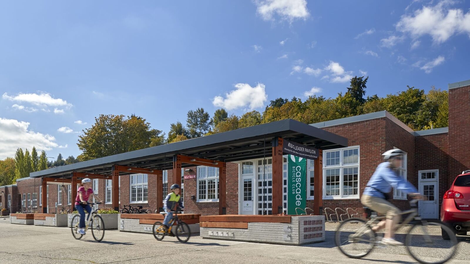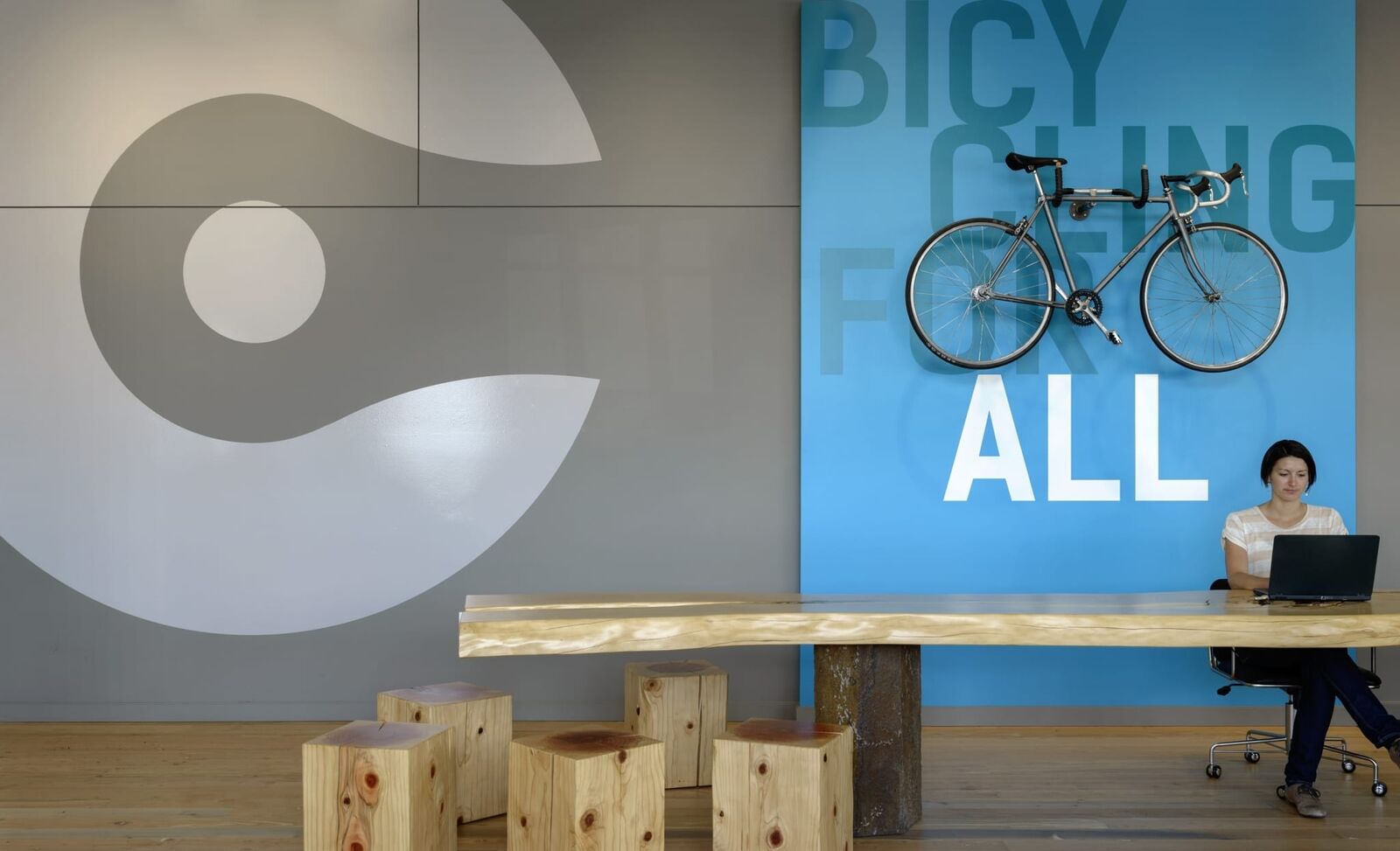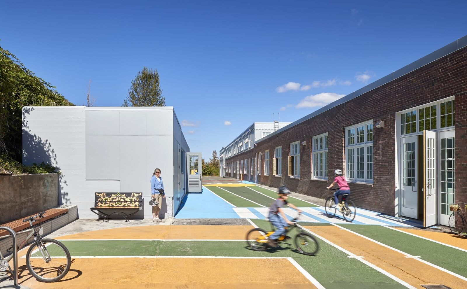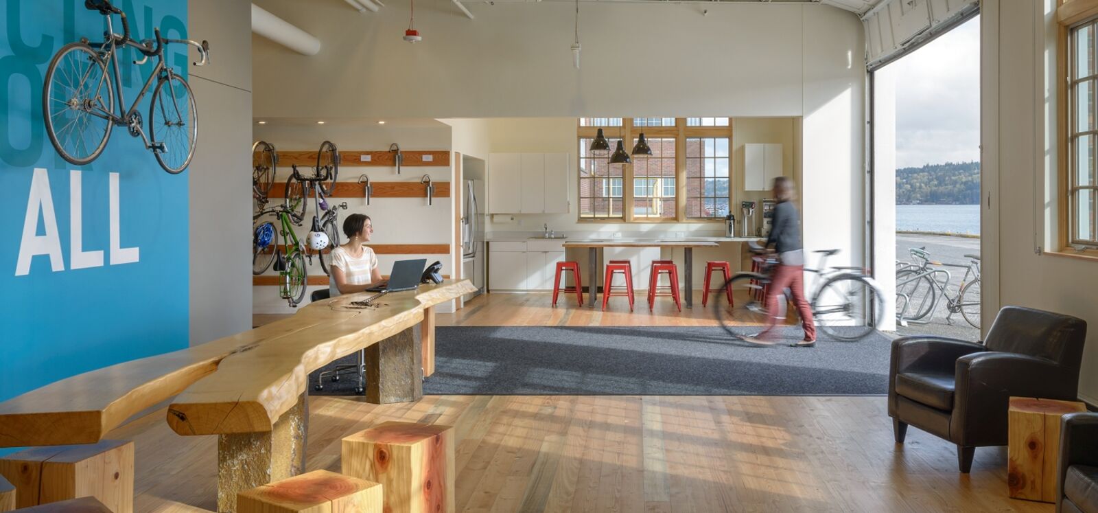 ZGF designed the two-phased, 8,000 SF headquarters for the largest independent bicycling organization in the nation. The facility expresses the club’s mission of creating a sense of community amongst a diverse group of cyclists while supporting their educational mission and advocacy initiatives. Located in the barracks of a former naval base, the project was conceived in four spatial zones—the clubhouse, office space, a multipurpose room and exterior pavilion and traffic garden—to cater to the workplace needs of CBC’s 40 employees, while also creating an iconic gathering space accessible to nearly 16,000 members. Inside the clubhouse a reception area, community kitchen, and lounge welcome members and offer a place to relax and use refueling stations. Adjacent to the clubhouse, the daylit open plan workspace is supported by a number of open and closed meeting spaces. The multipurpose room supports CBC’s educational goals, providing space for all age workshops, children’s camps, and community events. The education component extends to an exterior pavilion and traffic garden which provide additional social and training space.