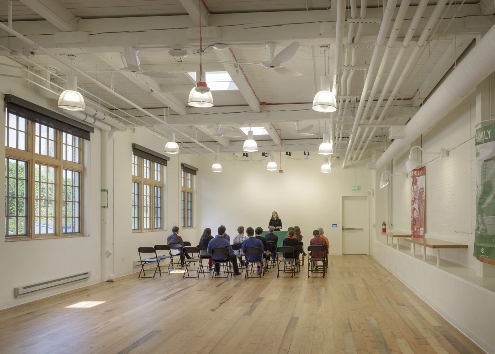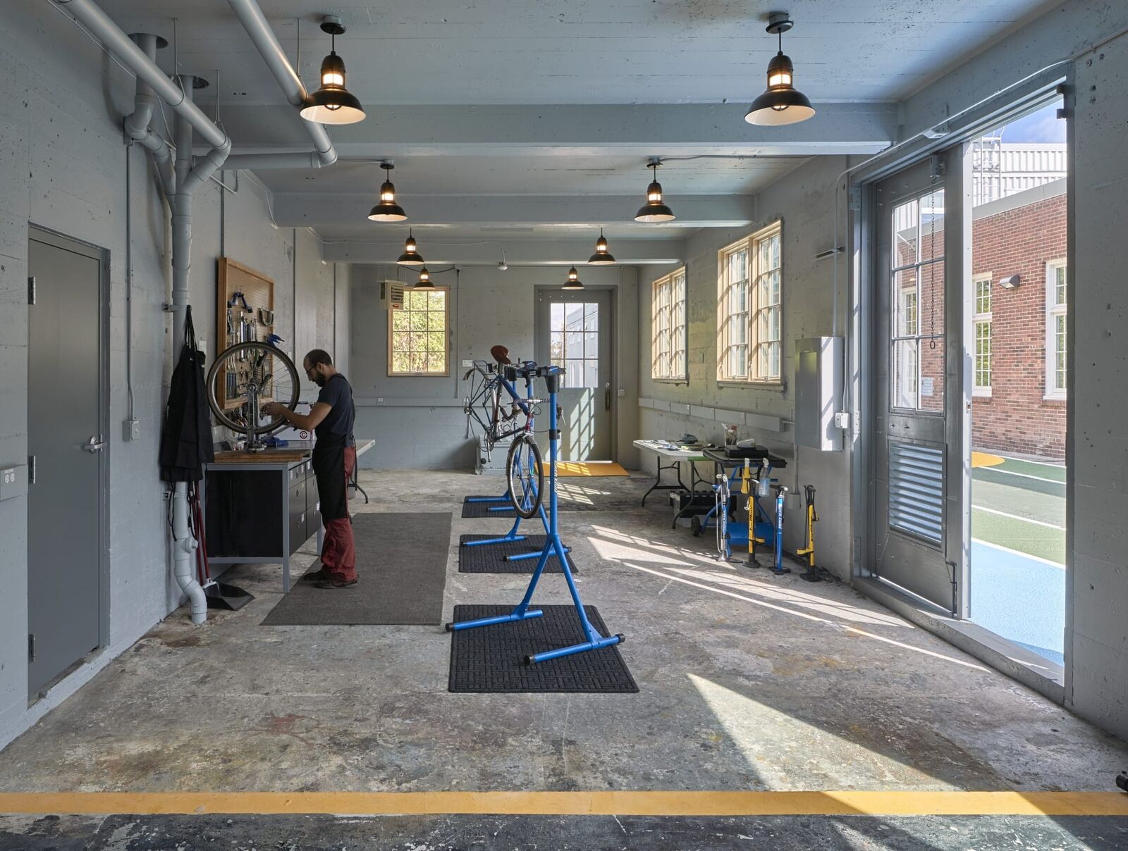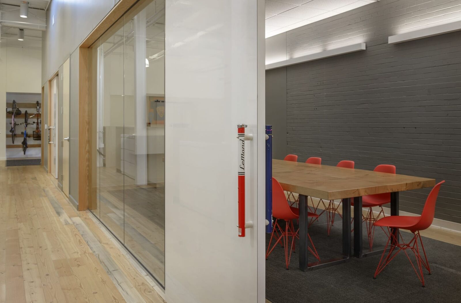 ZGF designed the two-phased, 8,000 SF headquarters for the largest independent bicycling organization in the nation. The facility expresses the club’s mission of creating a sense of community amongst a diverse group of cyclists while supporting their educational mission and advocacy initiatives. Located in the barracks of a former naval base, the project was conceived in four spatial zones—the clubhouse, office space, a multipurpose room and exterior pavilion and traffic garden—to cater to the workplace needs of CBC’s 40 employees, while also creating an iconic gathering space accessible to nearly 16,000 members. Inside the clubhouse a reception area, community kitchen, and lounge welcome members and offer a place to relax and use refueling stations. Adjacent to the clubhouse, the daylit open plan workspace is supported by a number of open and closed meeting spaces. The multipurpose room supports CBC’s educational goals, providing space for all age workshops, children’s camps, and community events. The education component extends to an exterior pavilion and traffic garden which provide additional social and training space.