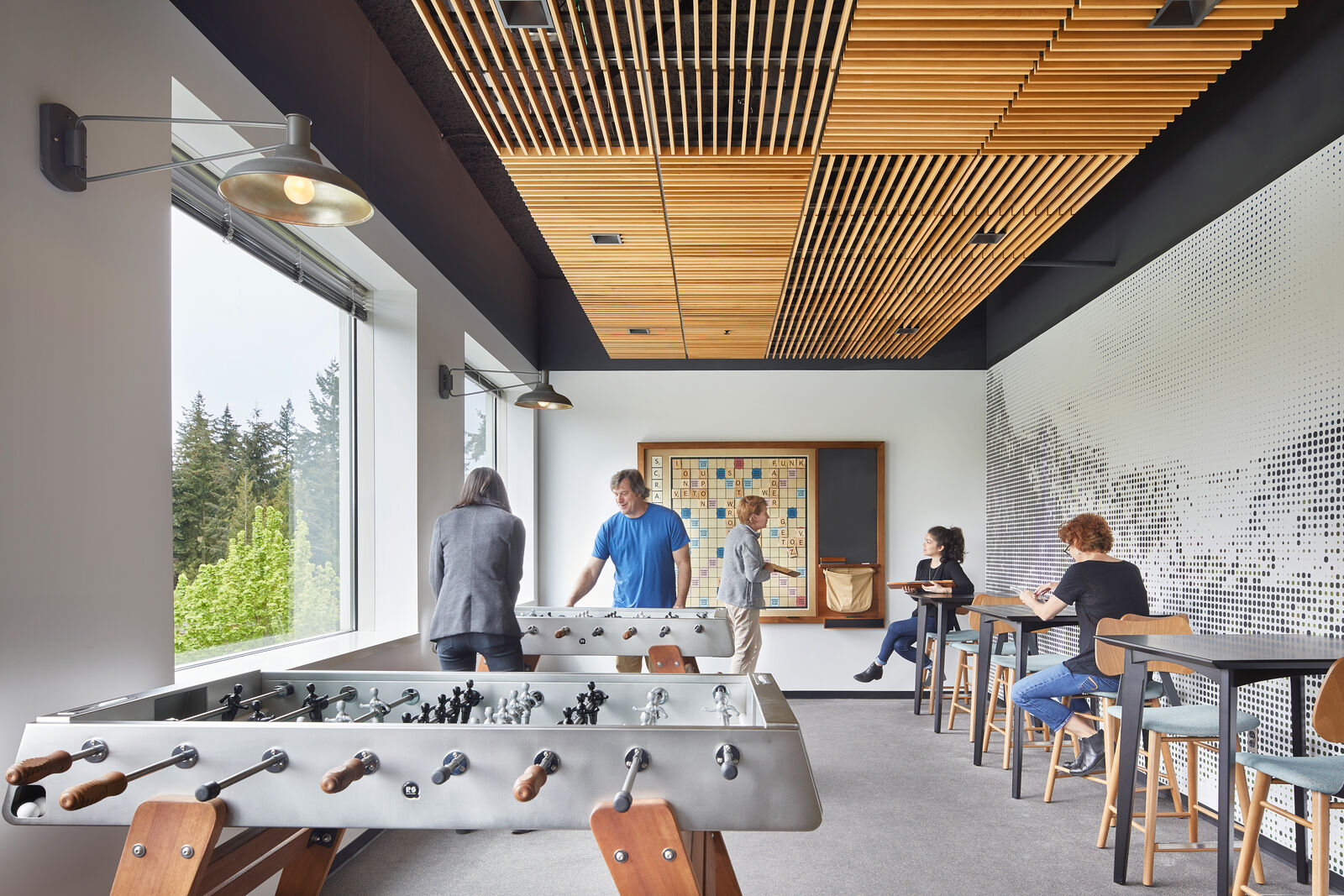 ZGF worked as part of an integrated Design-Build team to deliver a 175,760 SF renovated, four-story office building for a confidential high-tech client in Redmond, Washington. As one of the first Intelligent Workplace projects, the design team worked closely with user groups to create a program that responds to various workstyles and fosters flexibility and transparency. Organized into neighborhoods by functional group, workspaces include open plan offices surrounded by breakout spaces with a variety of furniture and writable surfaces. Support spaces throughout the building include three themed specialty rooms per floor that encourage interaction and movement; relaxation rooms and libraries for heads down work. Hubs are located on each floor and include kitchens and informal dining areas. Adjacent to the lobby and near the center of the building, a large common space features dining recreation, and casual seating. Garage doors allow the space to be partitioned. A communicating central stairway connects all floors with the lobby and spurs spontaneous collaboration. Interiors emphasize materiality and muted colors native to the Pacific Northwest and artwork from the client's collection.