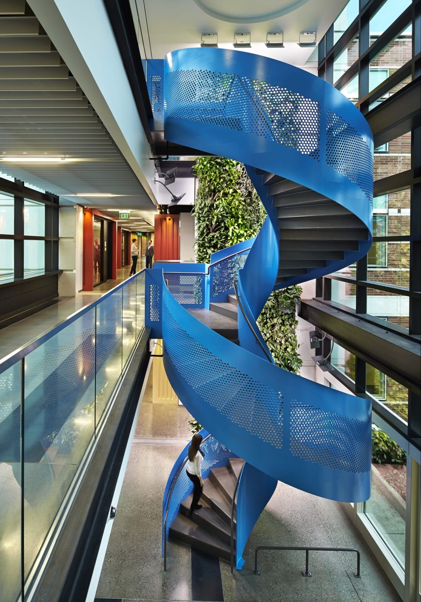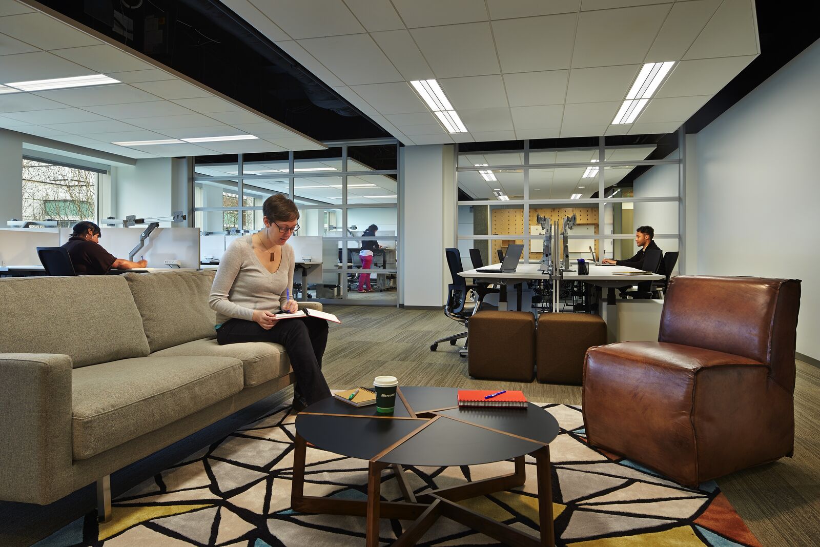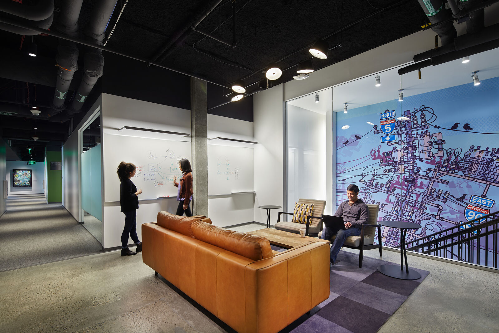 ZGF has applied new and evolving workplace standards to more than a million square feet which includes open plan offices organized into team-based neighborhoods supported by meeting rooms, phone rooms and quiet rooms that support individual heads-down work. Common gathering spaces throughout buildings that foster cross-team and cross-disciplinary collaboration include garages for large gathering and recreation, hubs which provide food and drink, nodes with comfortable furniture that provide impromptu gathering spaces, lounges and relaxation spaces, and a signature lobby and central feature stair.